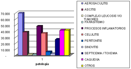 Las causas sanitarias de decomiso (72%) involucran a 138.998 aves y las patologías más frecuentemente observadas (31% del total) incluyeron peritonitis, sinovitis, celulitis y pericarditis, todas procesos inflamatorios.